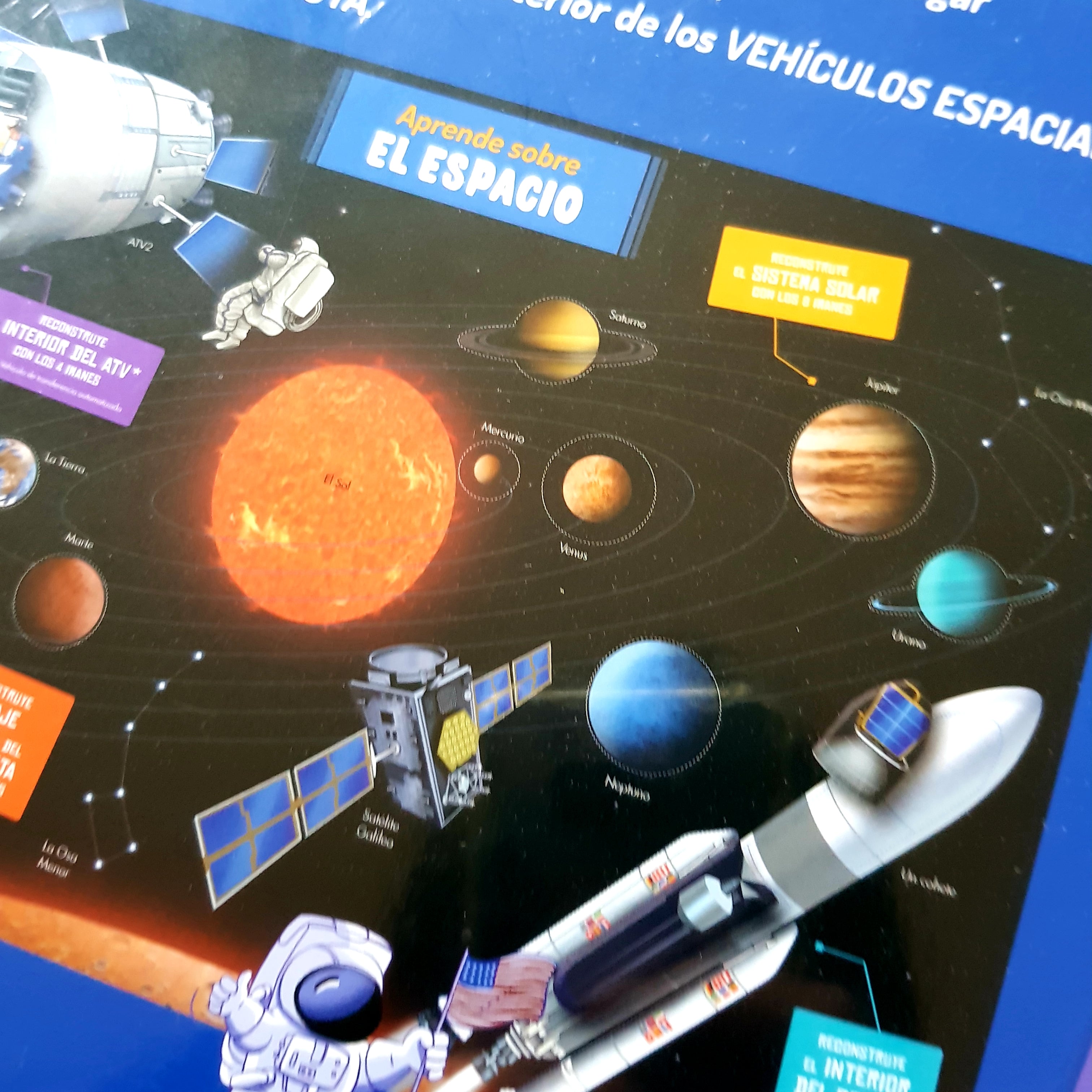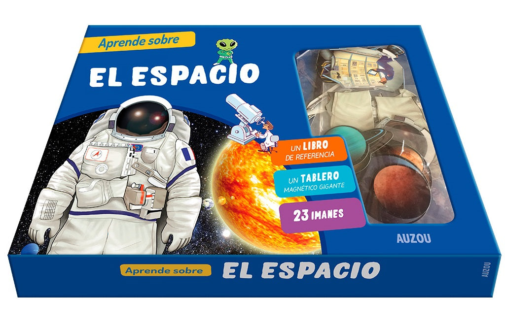 Un estuche con un tablero magnético e imanes y un libro para aprender todo sobre el espacio